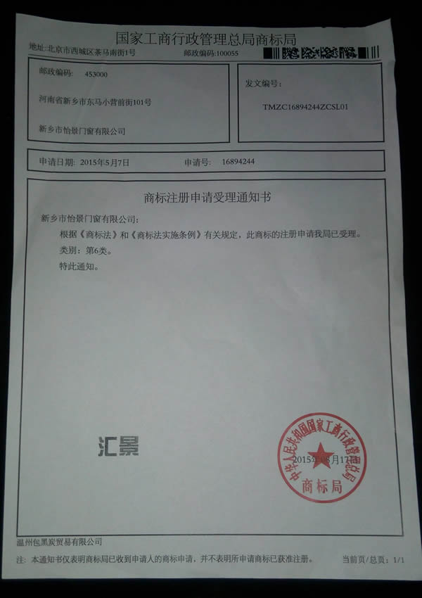 "匯景"商標受理通知書