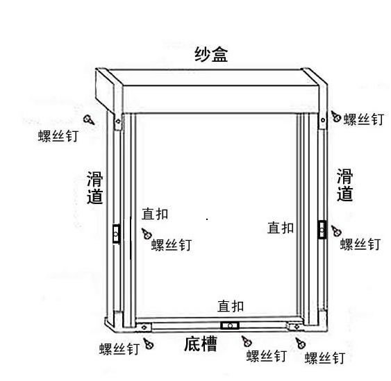 2、紗盒安裝后,在窗戶兩邊邊框上打眼安裝卡扣,卡扣必須和紗盒堵腳在一條直線上, 1米以上高的窗戶得安裝2個(gè)卡扣。