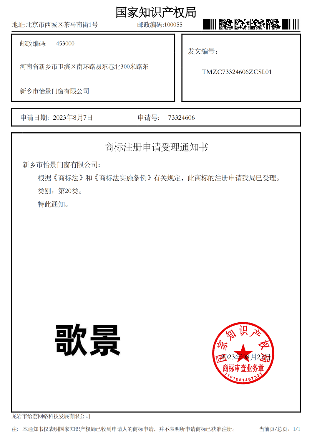 新鄉市怡景門窗有限公司注冊“歌景”商標受理通知