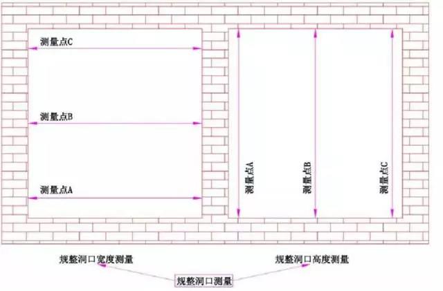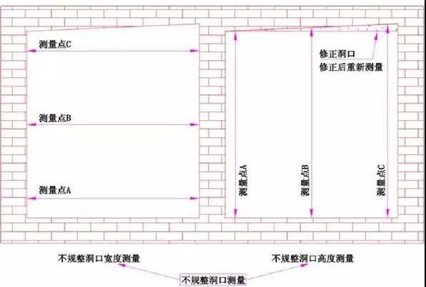 直角洞口2斜形洞口 寬度尺寸與方向洞口測量方法一樣,高度方向要測量左右兩邊的尺寸算及中間點的尺寸,以便后續在CAD中模擬比對確定斜度。