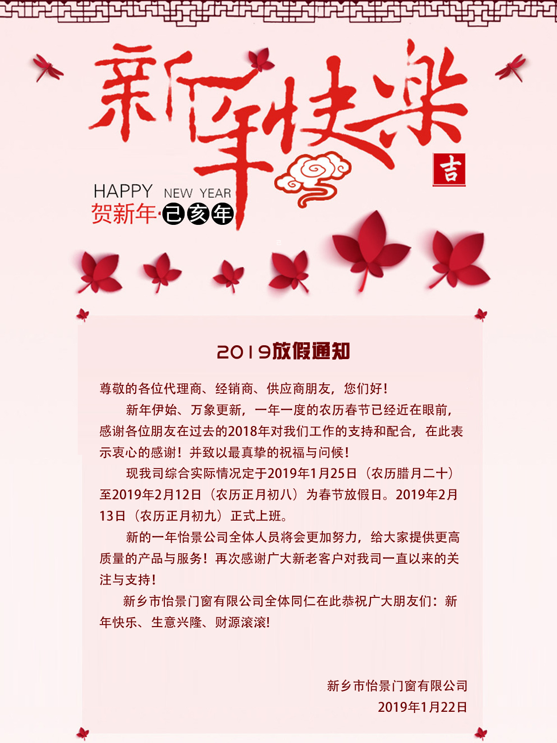 新鄉市怡景門窗有限公司全體同仁在此恭祝廣大朋友們:新年快樂、生意興隆、財源滾滾!