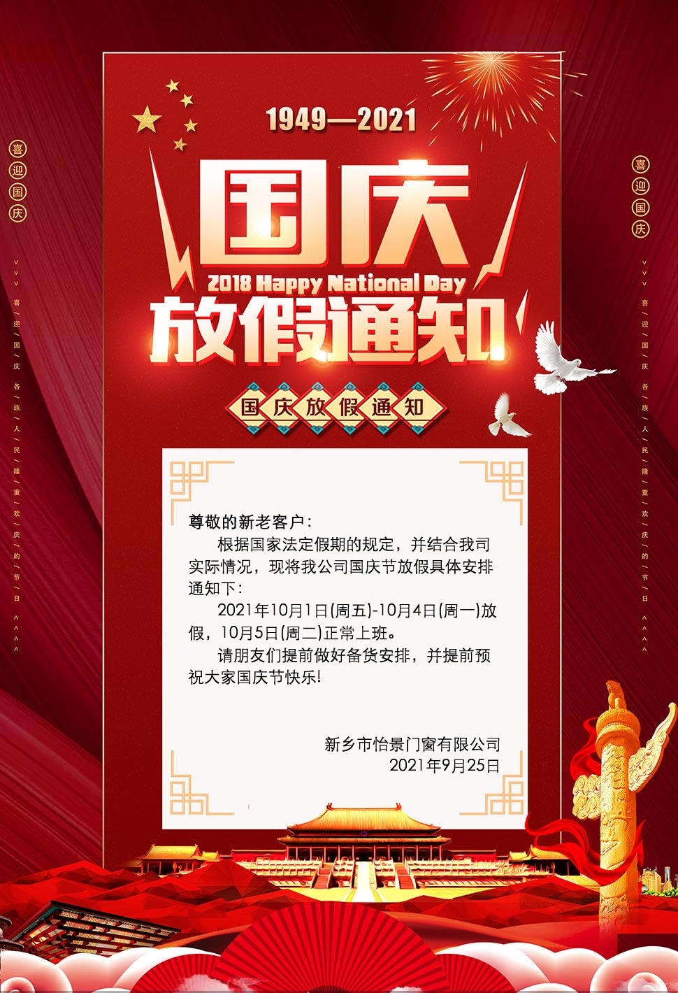 2021國慶節(jié)放假通知-新鄉(xiāng)市怡景門窗有限公司